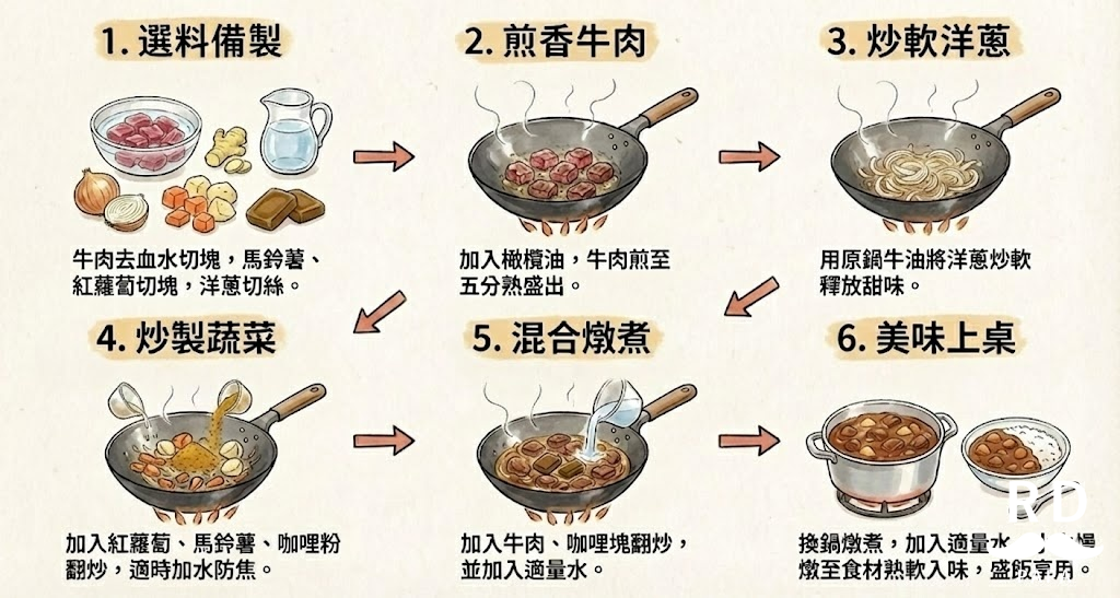 1.選料備製: 牛肉去血水後切塊,泡在冷水半小時(可用米酒、少許薑片去腥),馬鈴薯與紅蘿蔔滾刀切塊,洋蔥切絲。