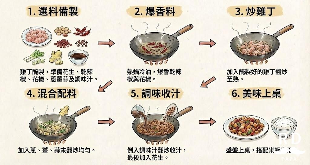這食譜特別注重雞肉的事前醃製與「碗芡」醬汁的黃金比例,搭配乾辣椒與花椒在熱油中爆香出的獨特鑊氣,讓雞丁在保持鮮嫩多汁的同時,花生也能維持酥脆口感,是能在家輕鬆複製出超越一般熱炒店水準的美味做法。