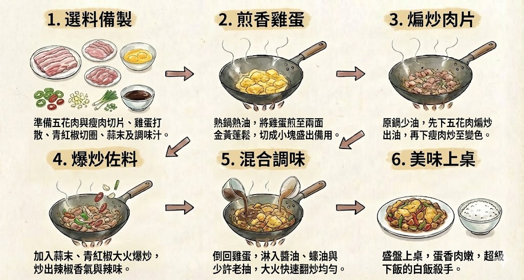 在這份食譜中,我們同時選用了油脂豐富的五花肉來煸香,以及醃製過的瘦肉來提供滑嫩口感。重點是要先將雞蛋煎至金黃蓬鬆並盛出備用,絕不能炒老了;最後再將所有食材與靈魂醬汁大火爆炒匯合。這是一個能讓您在家輕鬆複製出鑊氣十足、蛋香肉嫩,美味甚至超越餐廳的做法喔!