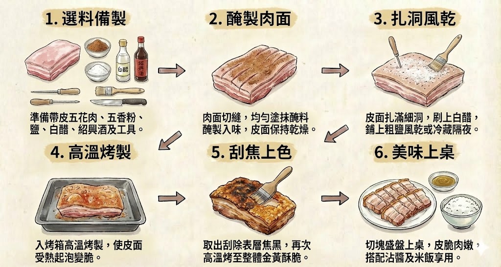 在這份食譜中,我們選用了層次漂亮的帶皮五花肉。重點在於採取「肉皮分離」的處理邏輯:肉面要醃製入味,但皮面必須保持絕對乾燥並扎滿細孔;最後再透過精準的兩段式溫控火候,先烤熟肉再高溫爆皮。這是一個能讓您在家輕鬆複製出皮脆肉嫩、金黃誘人,美味甚至超越一般燒臘店的做法喔!